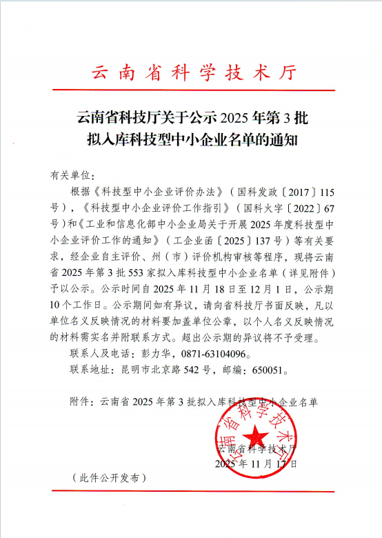 云南省2025年第3批擬入庫科技型中小企業(yè)名單公示