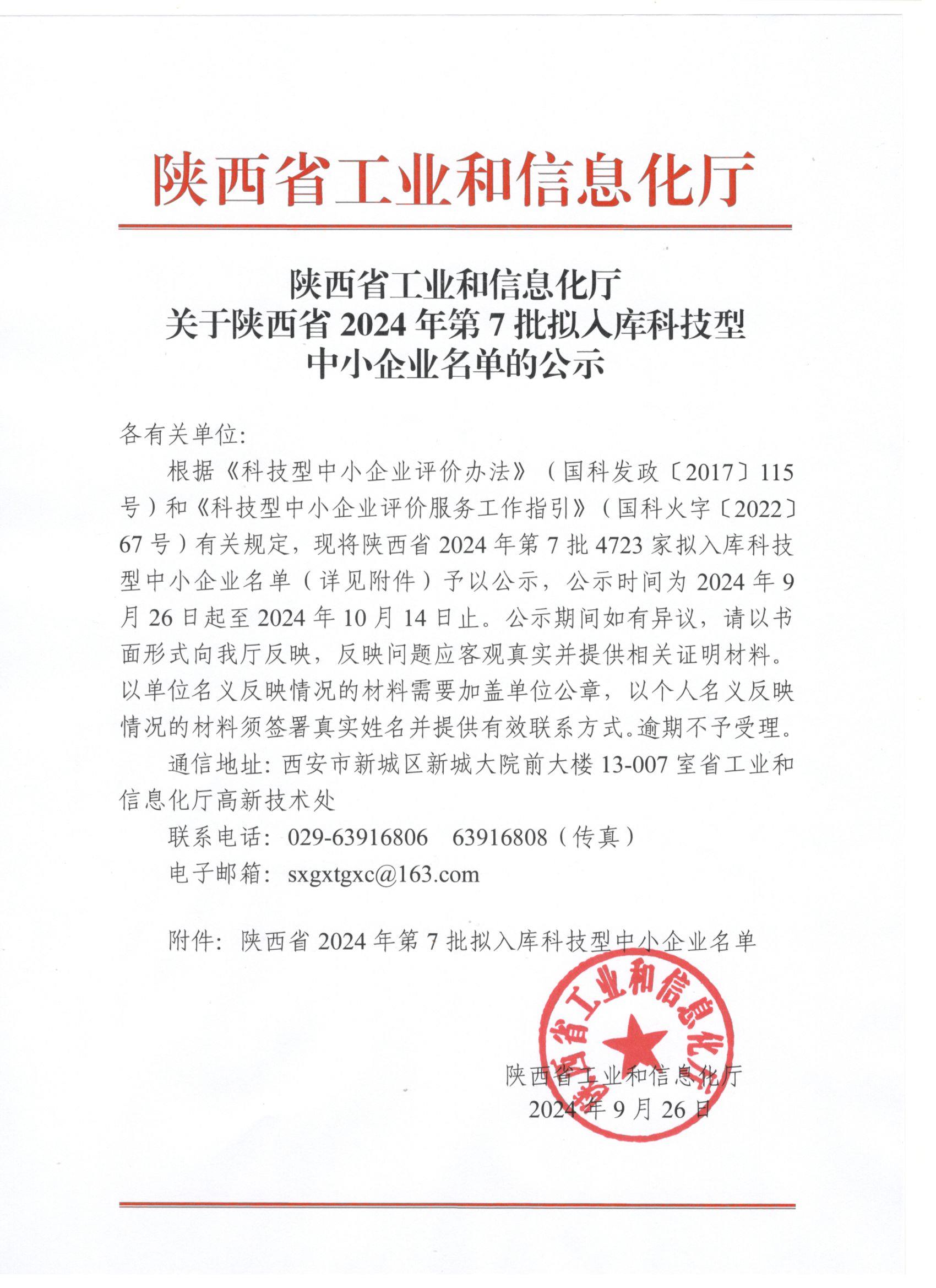 陜西省2024年第7批擬入庫(kù)科技型中小企業(yè)名單公示正文.jpg PICTURE