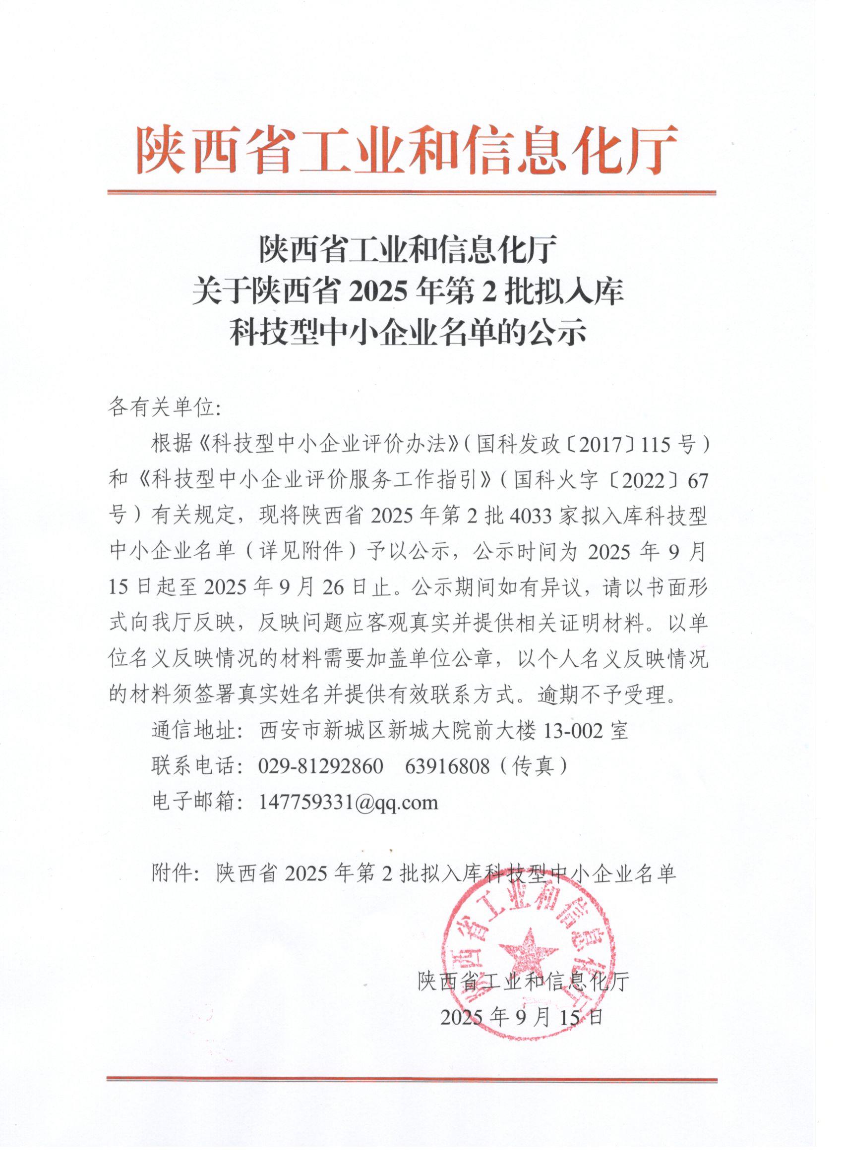 陜西省2025年第2批擬入庫科技型中小企業(yè)名單公示