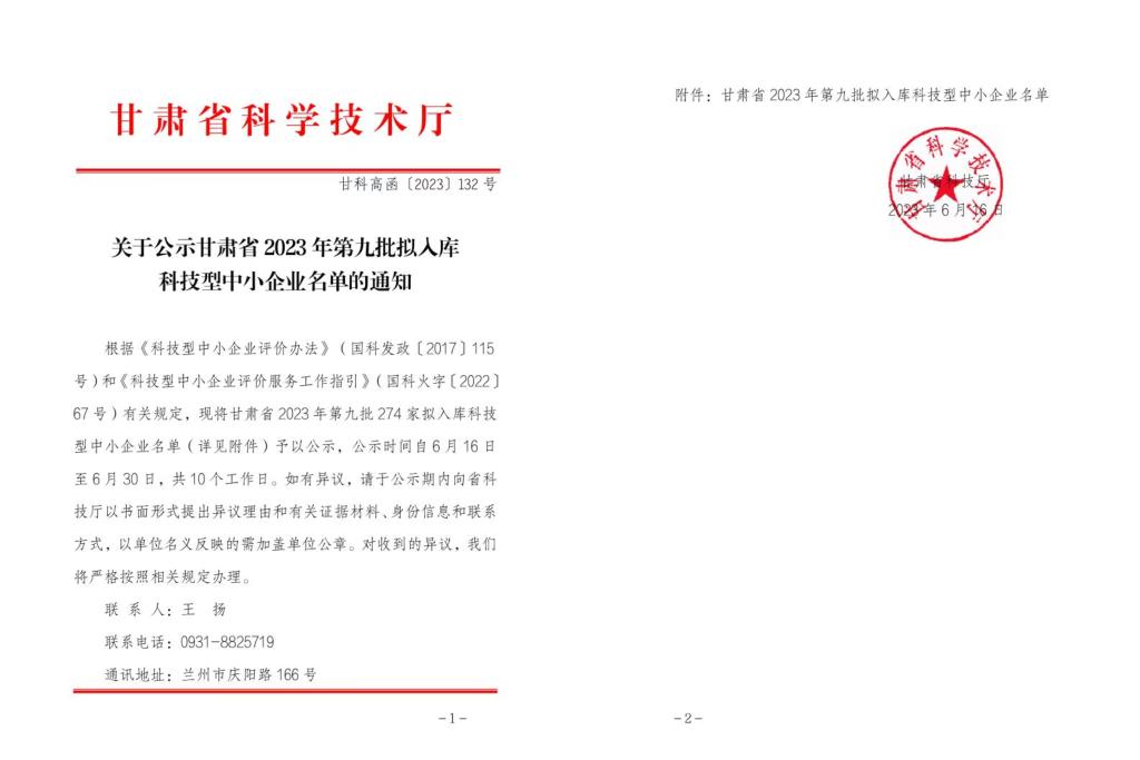 甘肅省2023年第9批擬入庫科技型中小企業(yè)名單公示