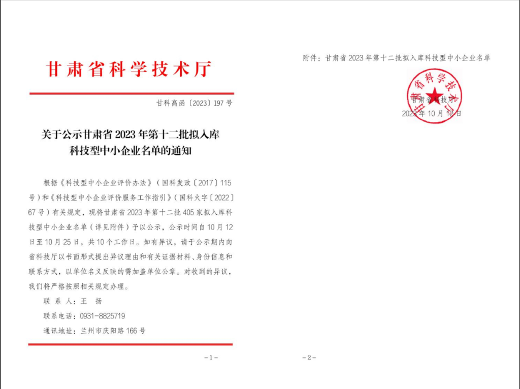 甘肅省2023年第12批擬入庫科技型中小企業(yè)名單公示