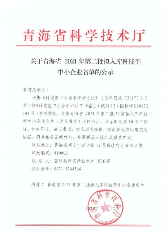 青海省2021年第2批擬入庫科技型中小企業(yè)名單公示