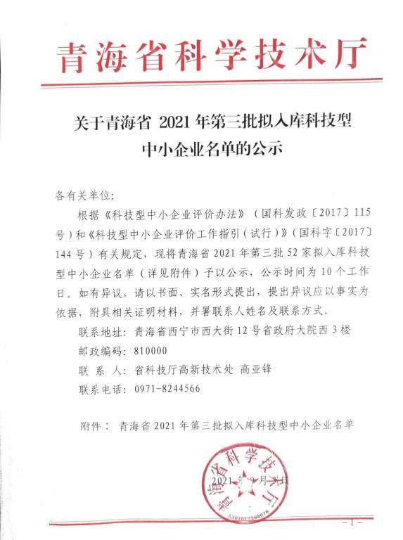 青海省2021年第3批擬入庫(kù)科技型中小企業(yè)名單公示正文.jpg PICTURE