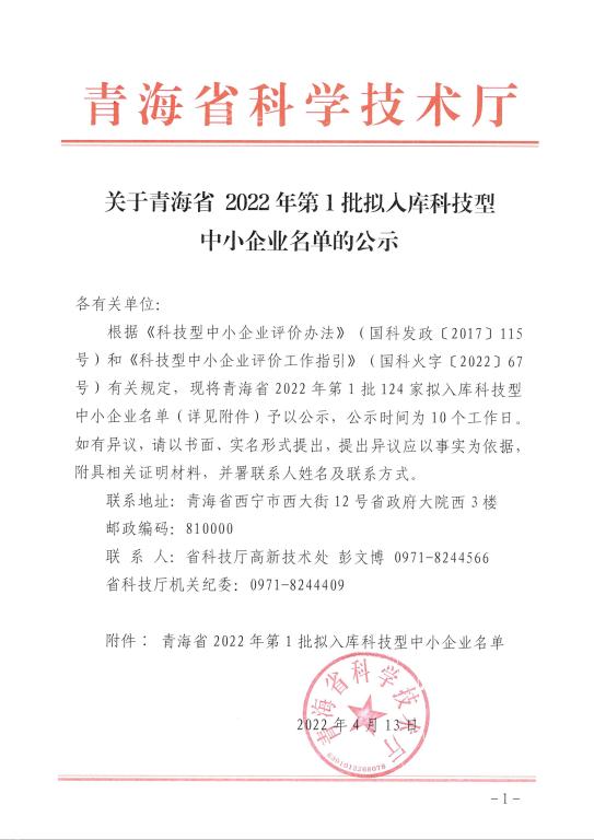 青海省2022年第1批擬入庫(kù)科技型中小企業(yè)名單公示正文.jpg PICTURE