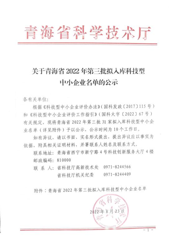 青海省2022年第3批擬入庫科技型中小企業(yè)名單公示