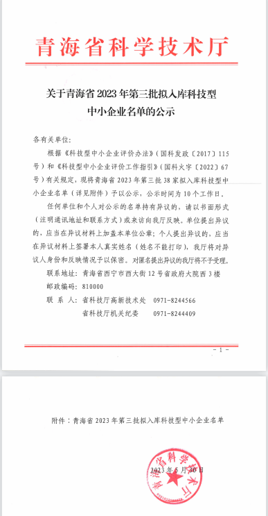 青海省2023年第3批擬入庫科技型中小企業(yè)名單公示