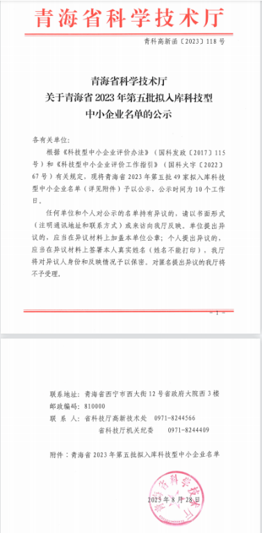 青海省2023年第5批擬入庫(kù)科技型中小企業(yè)名單公示正文.jpg PICTURE