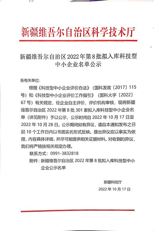 新疆維吾爾自治區(qū)2022年第8批擬入庫科技型中小企業(yè)名單公示