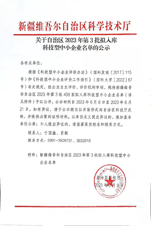 新疆維吾爾自治區(qū)2023年第3批擬入庫科技型中小企業(yè)名單公示