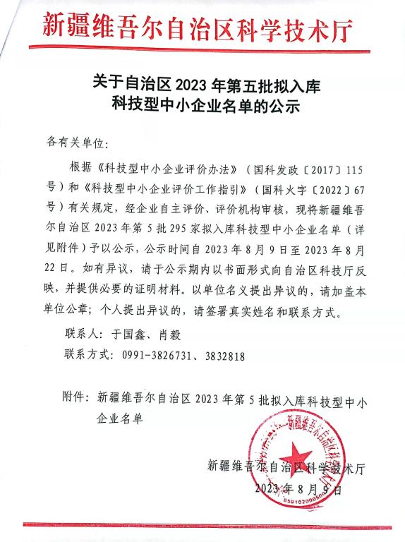 新疆維吾爾自治區(qū)2023年第5批擬入庫科技型中小企業(yè)名單公示