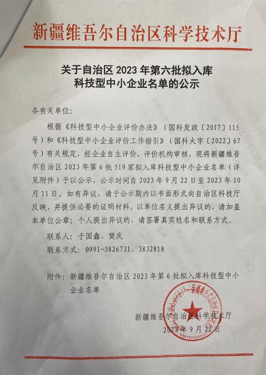 新疆維吾爾自治區(qū)2023年第6批擬入庫科技型中小企業(yè)名單公示