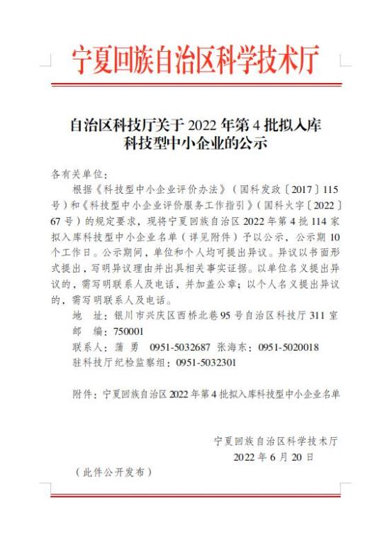 寧夏回族自治區(qū)2022年第4批擬入庫(kù)科技型中小企業(yè)名單公示正文.jpg PICTURE