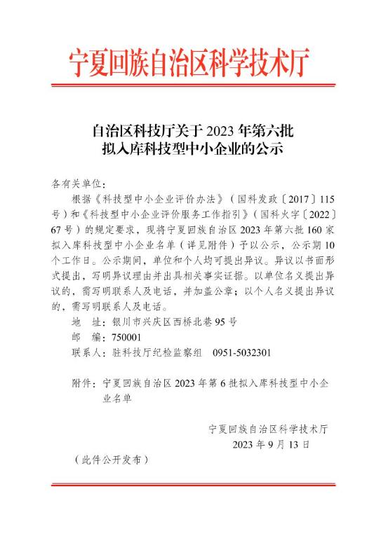 寧夏回族自治區(qū)2023年第6批擬入庫科技型中小企業(yè)名單公示