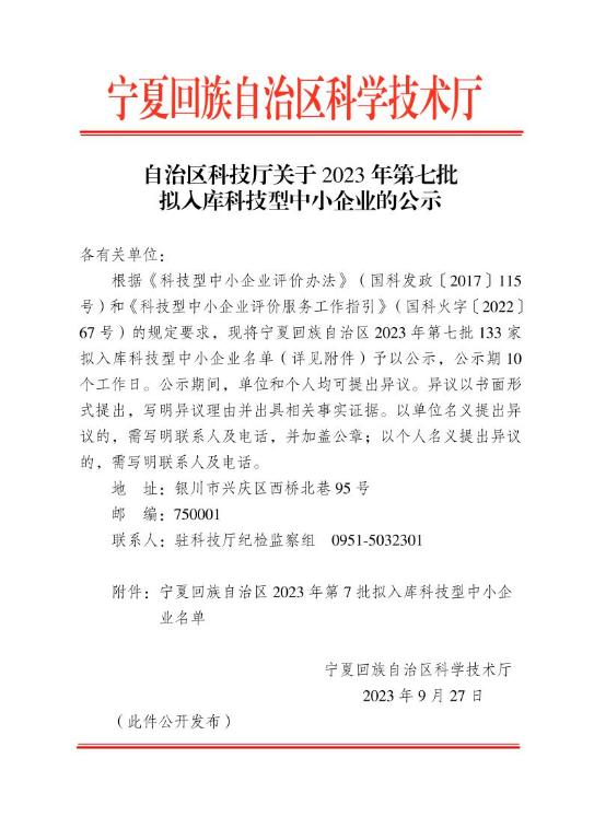 寧夏回族自治區(qū)2023年第7批擬入庫(kù)科技型中小企業(yè)名單公示正文.jpg PICTURE