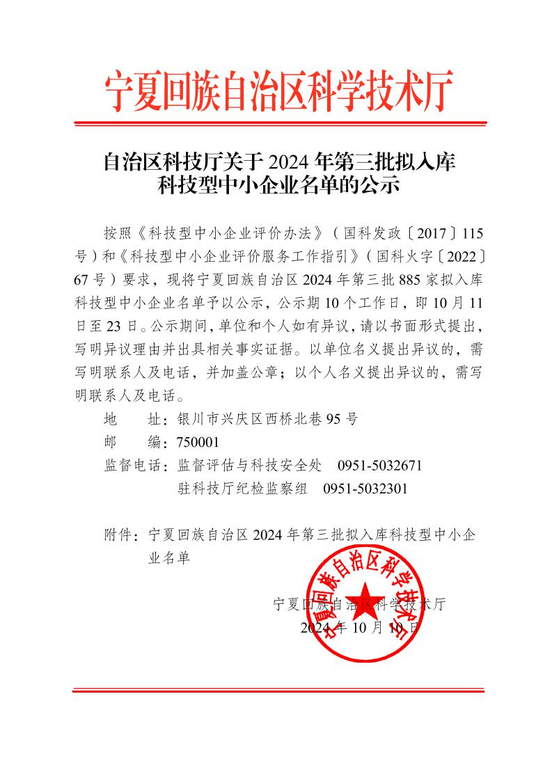寧夏回族自治區(qū)2024年第3批擬入庫科技型中小企業(yè)名單公示
