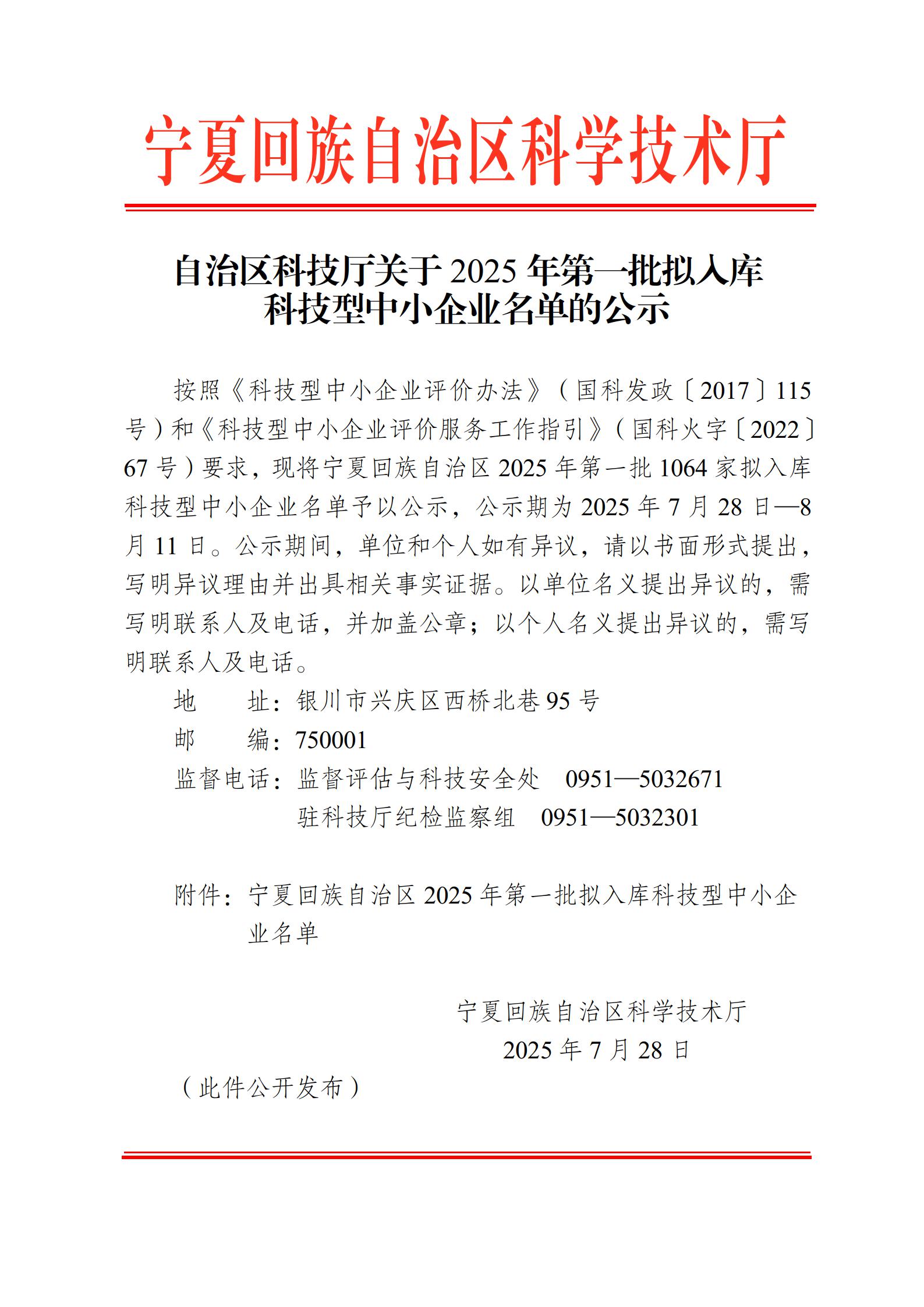 寧夏回族自治區(qū)2025年第1批擬入庫科技型中小企業(yè)名單公示