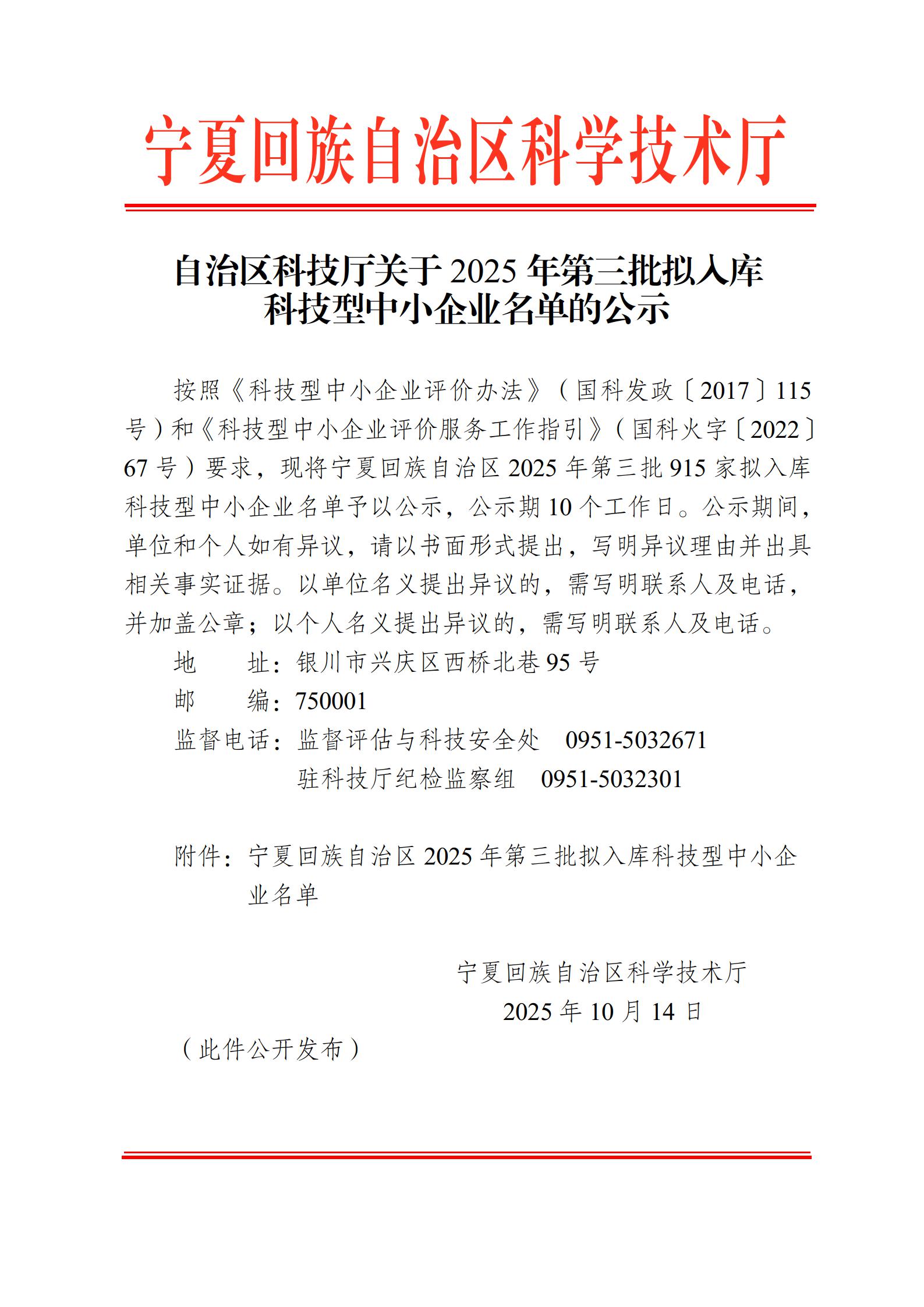 寧夏回族自治區(qū)2025年第3批擬入庫科技型中小企業(yè)名單公示