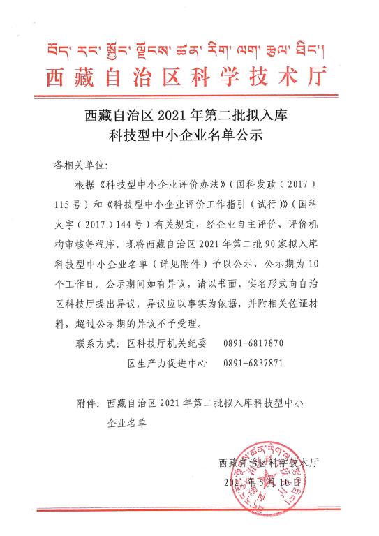 西藏自治區(qū)2021年第2批擬入庫科技型中小企業(yè)名單公示