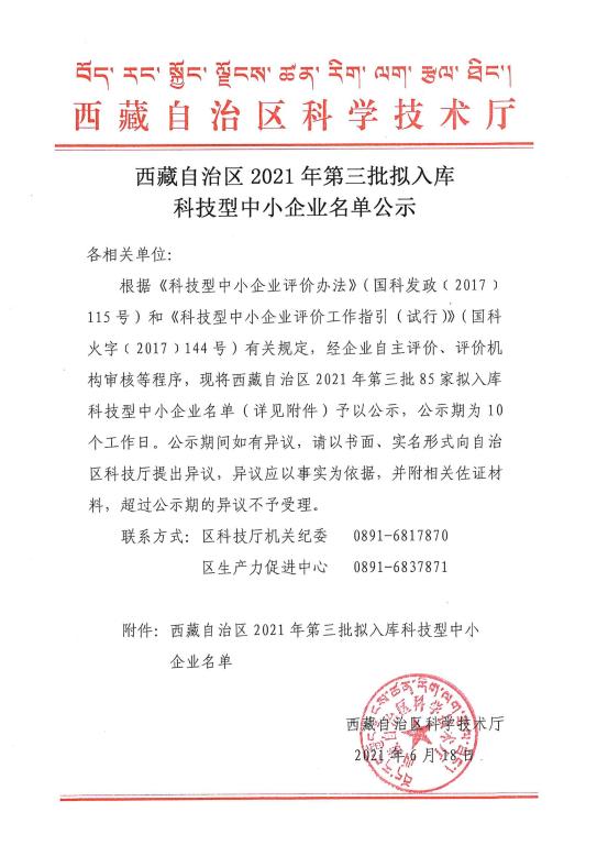 西藏自治區(qū)2021年第3批擬入庫科技型中小企業(yè)名單公示