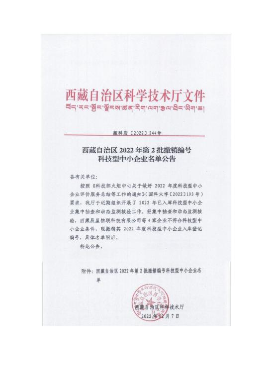 西藏自治區(qū)2022年第2批撤銷編號(hào)科技型中小企業(yè)名單公告