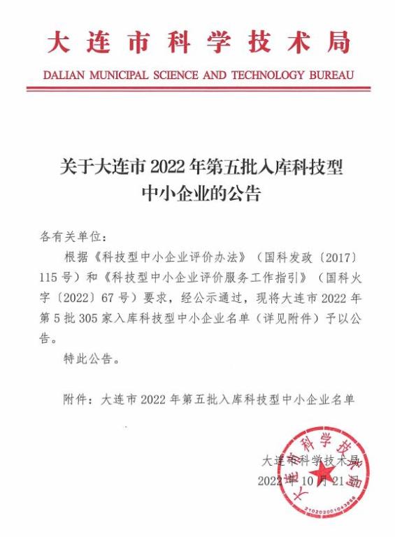 大連市2022年第5批入庫科技型中小企業(yè)名單公告