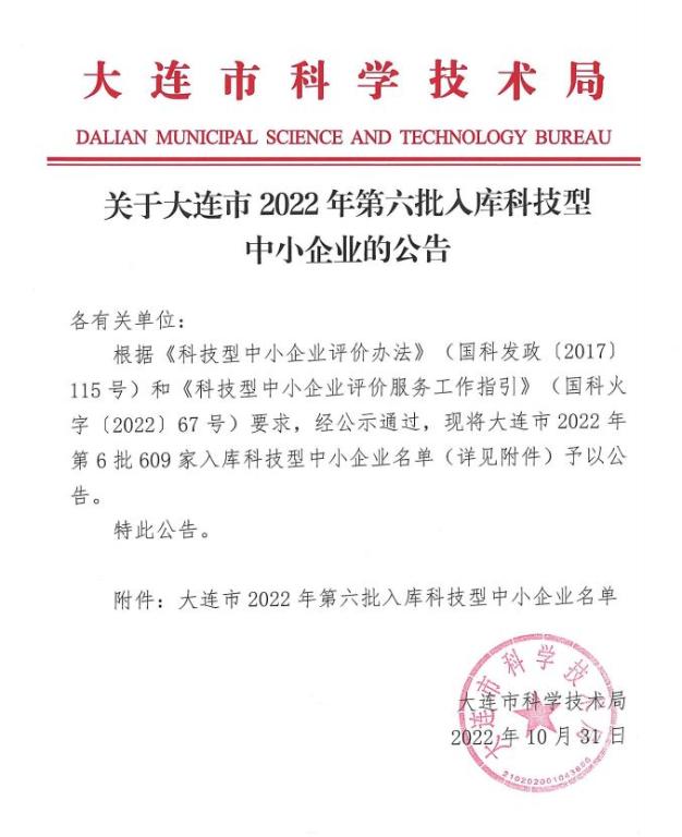 大連市2022年第6批入庫科技型中小企業(yè)名單公告