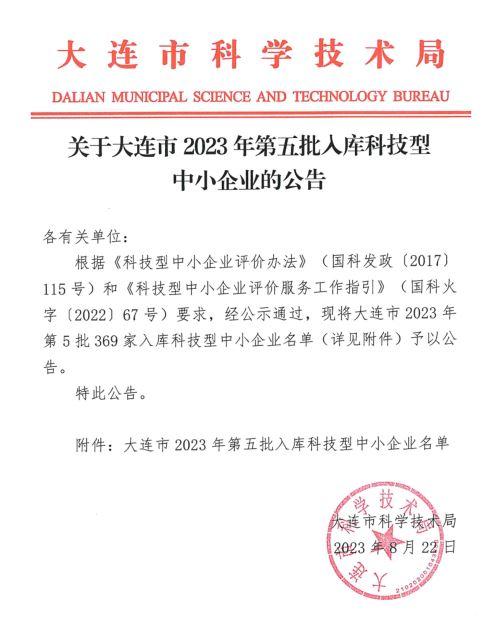 大連市2023年第5批入庫科技型中小企業(yè)名單公告