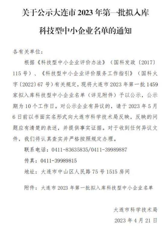 大連市2023年第1批擬入庫科技型中小企業(yè)名單公示