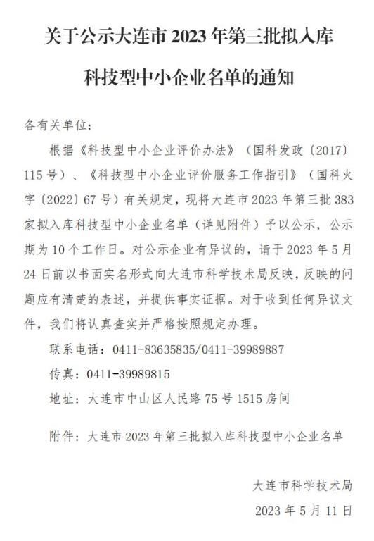 大連市2023年第3批擬入庫科技型中小企業(yè)名單公示