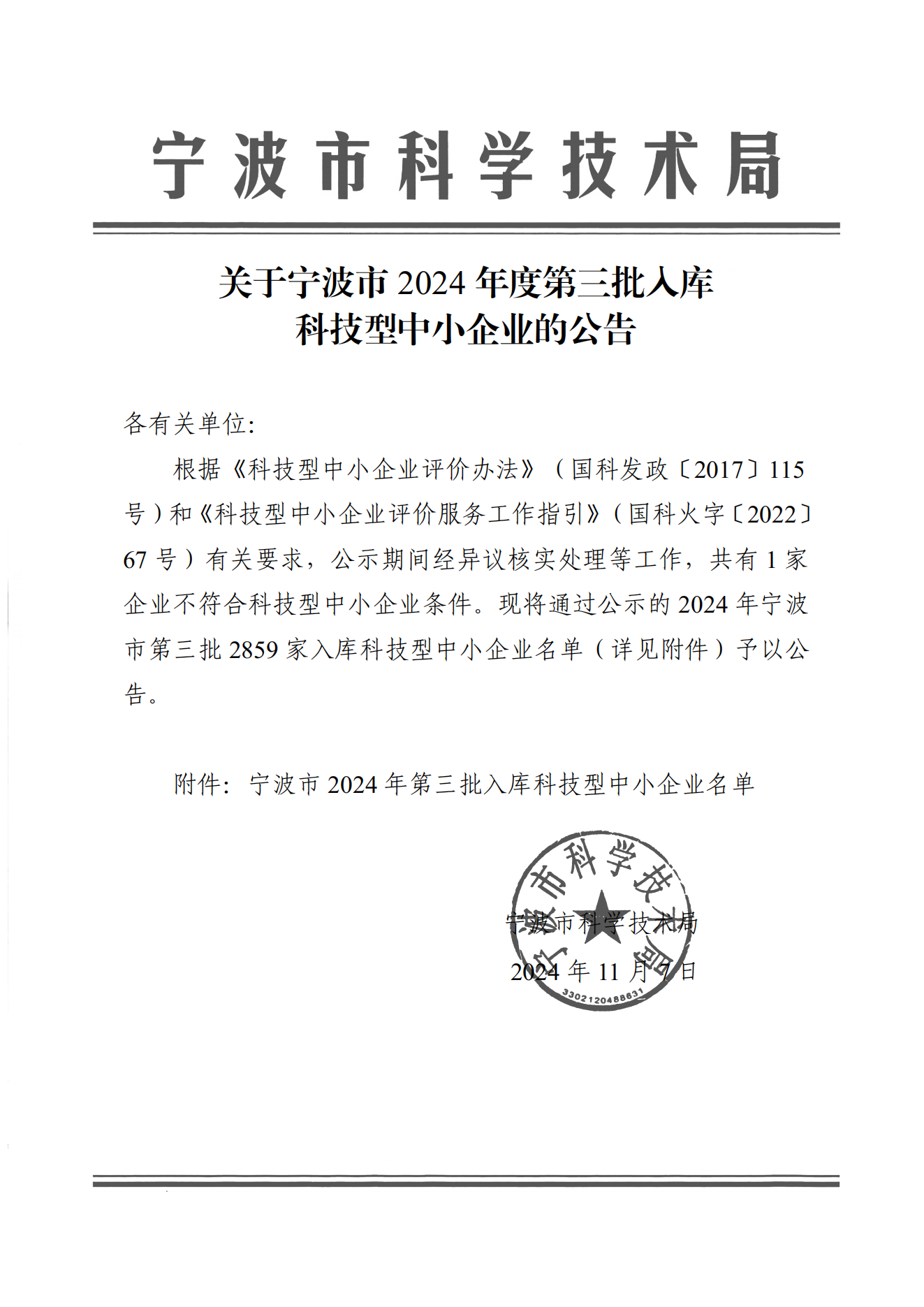 寧波市2024年第3批入庫科技型中小企業(yè)名單公告