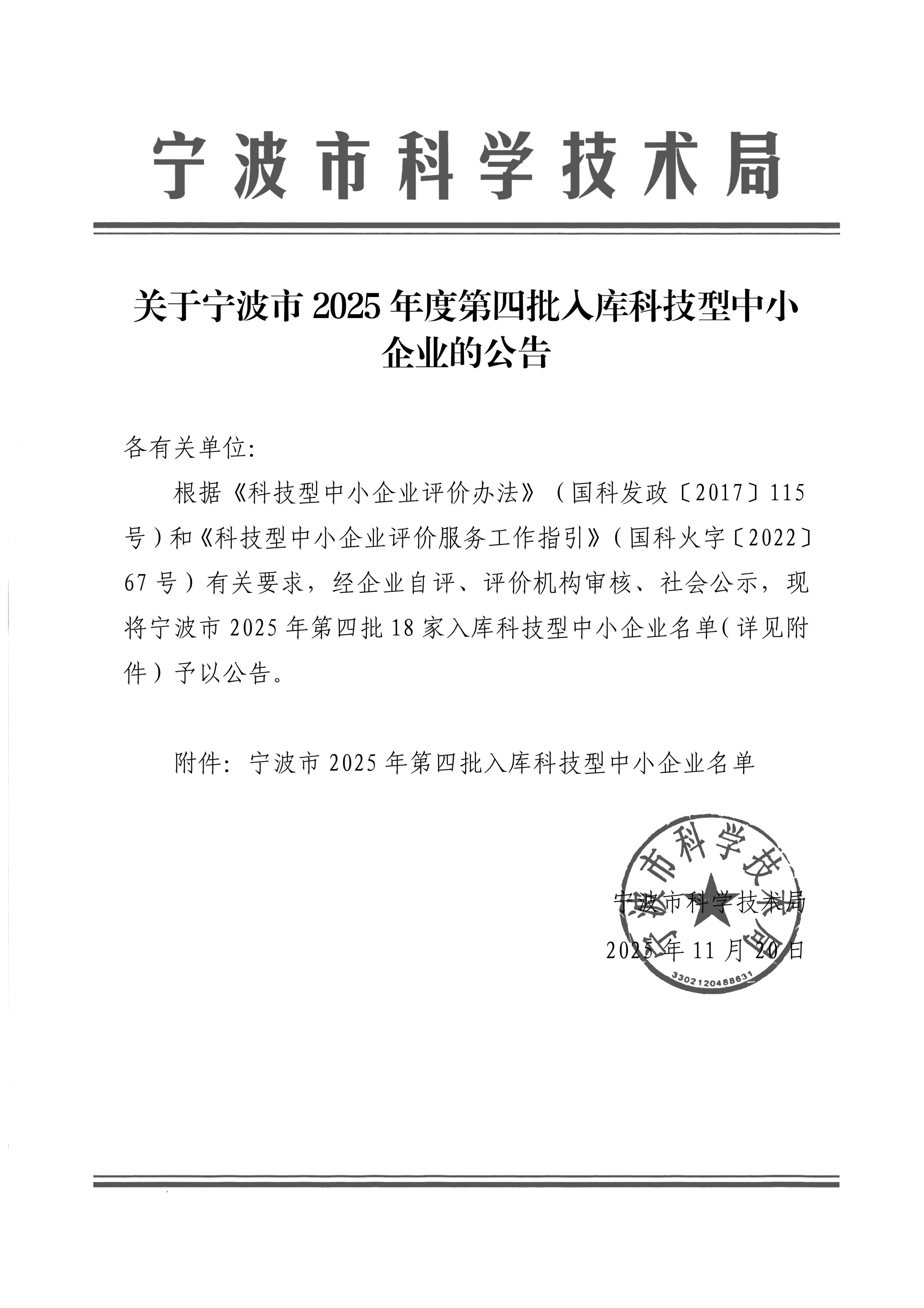 寧波市2025年第4批入庫科技型中小企業(yè)名單公告