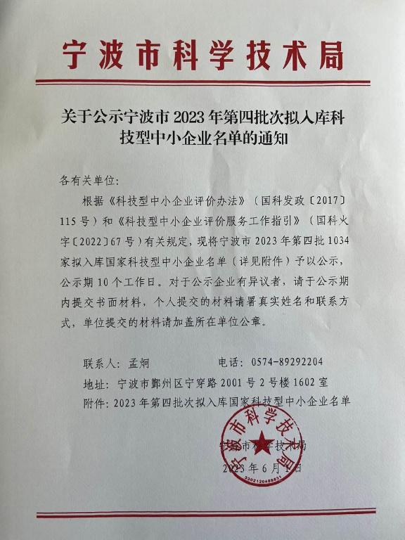 寧波市2023年第4批擬入庫(kù)科技型中小企業(yè)名單公示正文.jpg PICTURE