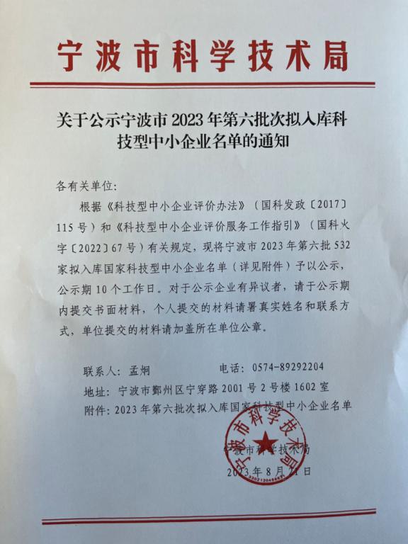 寧波市2023年第6批擬入庫(kù)科技型中小企業(yè)名單公示正文.jpg PICTURE