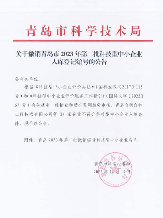 青島市2023年第2批撤銷(xiāo)編號(hào)科技型中小企業(yè)名單公告