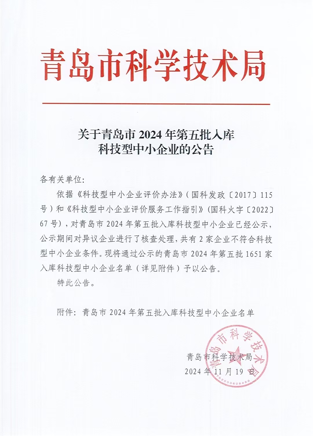 青島市2024年第5批入庫(kù)科技型中小企業(yè)名單公告正文.jpg PICTURE
