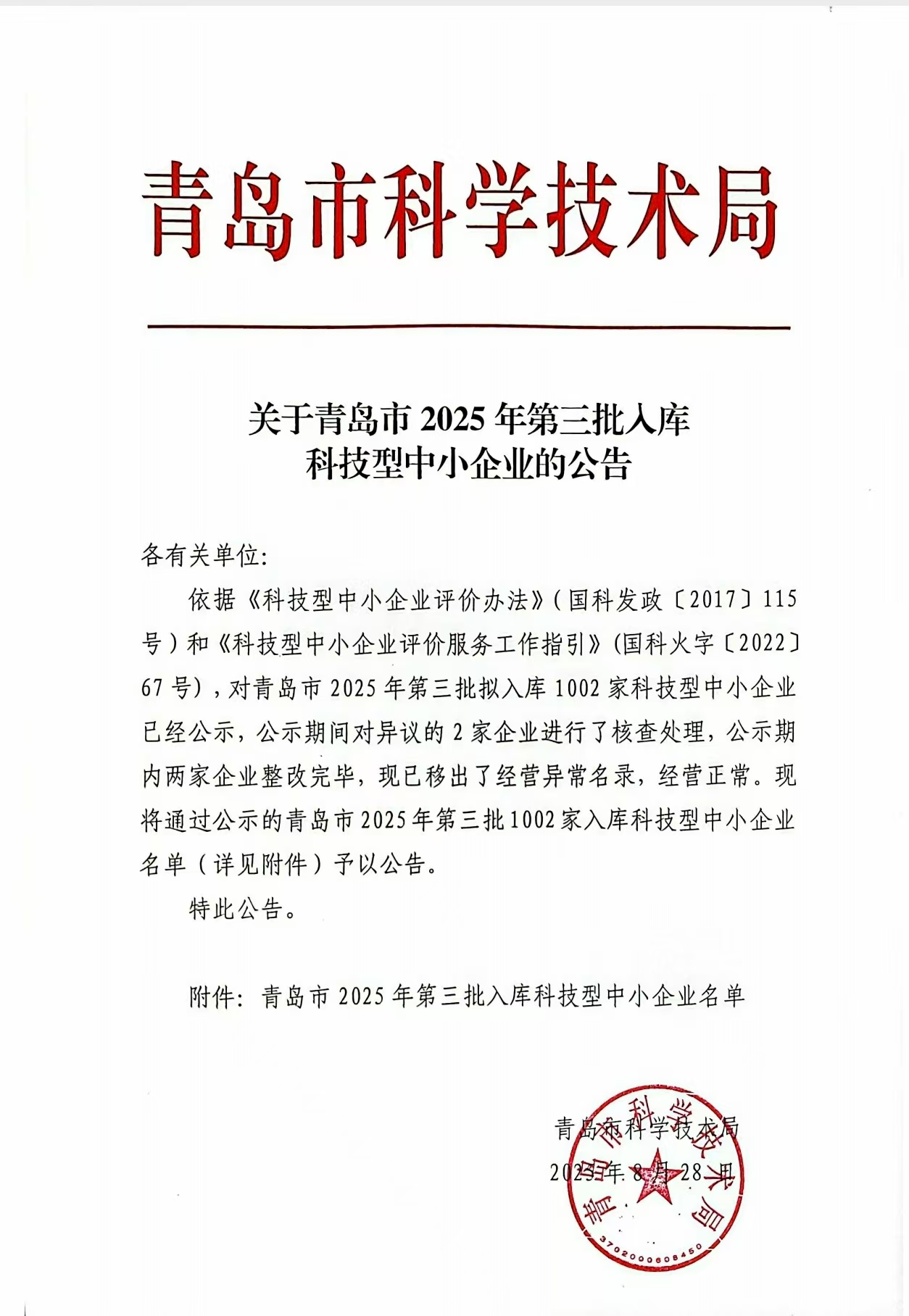 青島市2025年第3批入庫(kù)科技型中小企業(yè)名單公告正文.jpg PICTURE