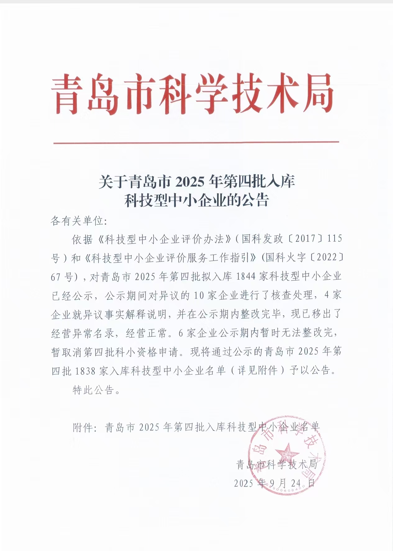 青島市2025年第4批入庫(kù)科技型中小企業(yè)名單公告