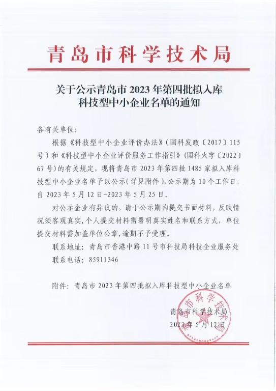 青島市2023年第4批擬入庫(kù)科技型中小企業(yè)名單公示正文.jpg PICTURE