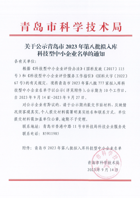 青島市2023年第8批擬入庫(kù)科技型中小企業(yè)名單公示正文.jpg PICTURE