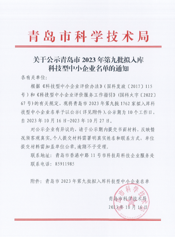 青島市2023年第9批擬入庫(kù)科技型中小企業(yè)名單公示正文.jpg PICTURE