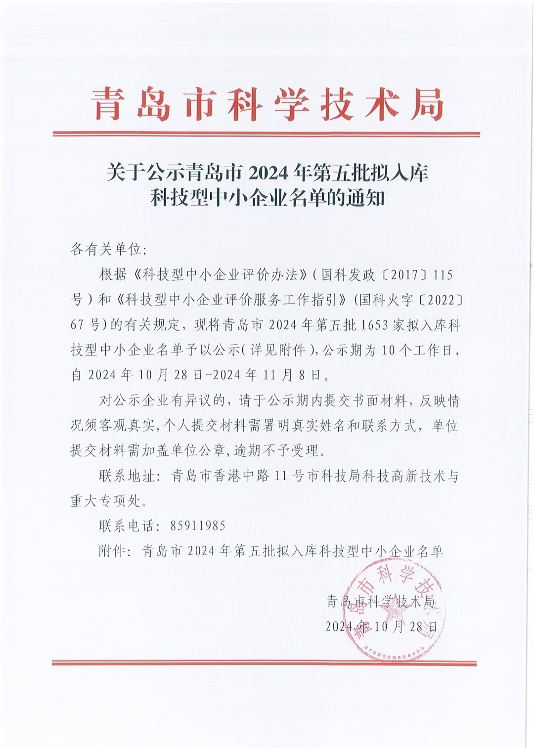 青島市2024年第5批擬入庫(kù)科技型中小企業(yè)名單公示正文.jpg PICTURE