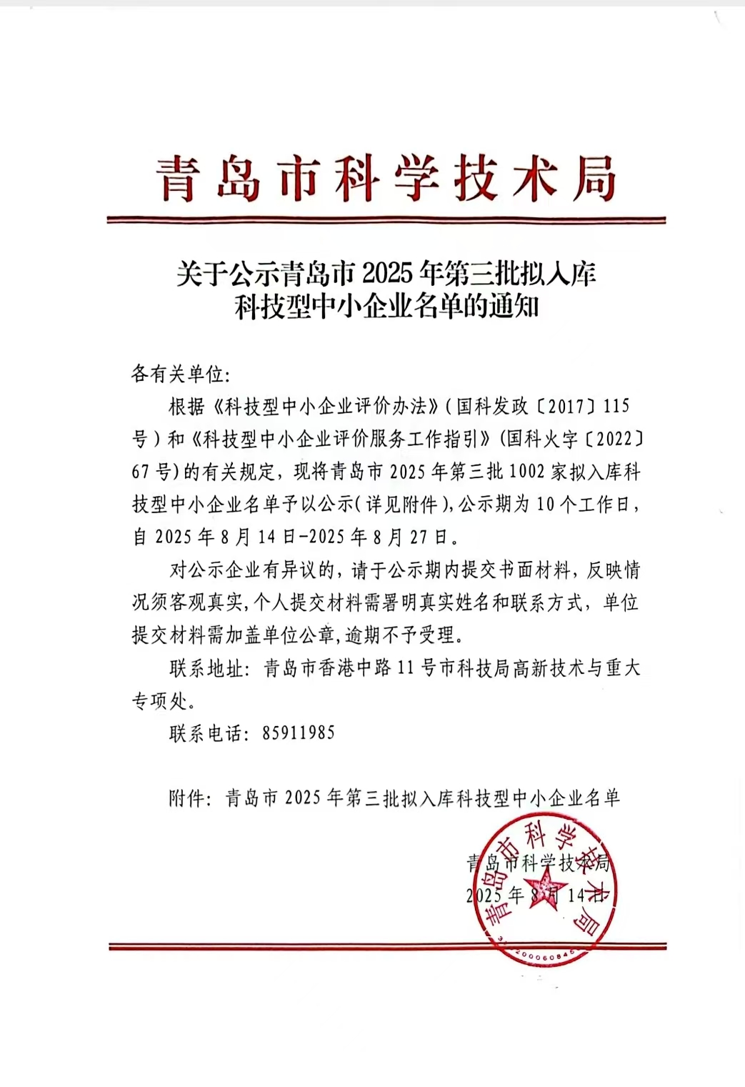 青島市2025年第3批擬入庫(kù)科技型中小企業(yè)名單公示正文.jpg PICTURE