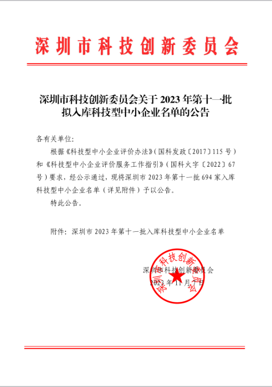 深圳市2023年第11批入庫科技型中小企業(yè)名單公告