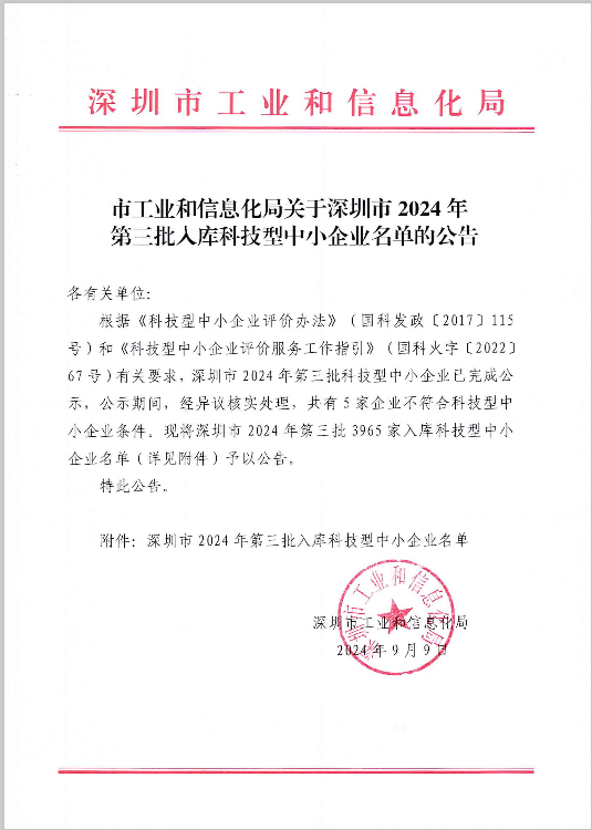 深圳市2024年第3批入庫科技型中小企業(yè)名單公告