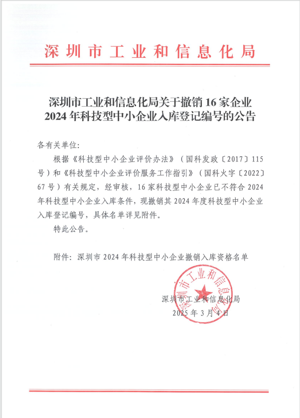 深圳市2025年第1批撤銷編號科技型中小企業(yè)名單公告