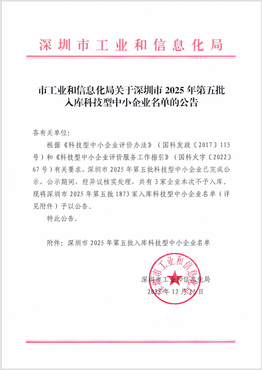 深圳市2025年第5批入庫科技型中小企業(yè)名單公告