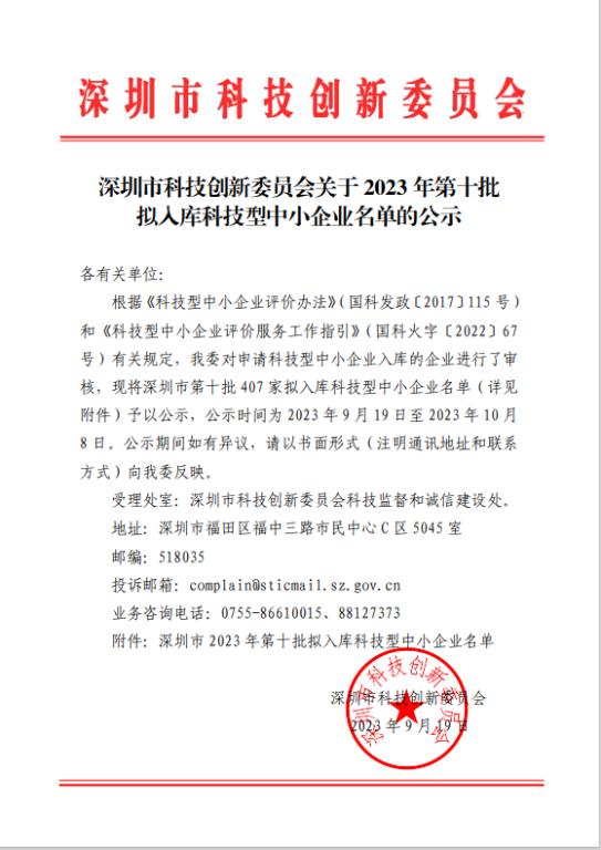深圳市2023年第10批擬入庫科技型中小企業(yè)名單公示