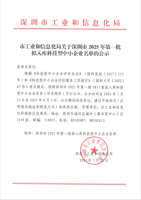 深圳市2025年第1批擬入庫科技型中小企業(yè)名單公示
