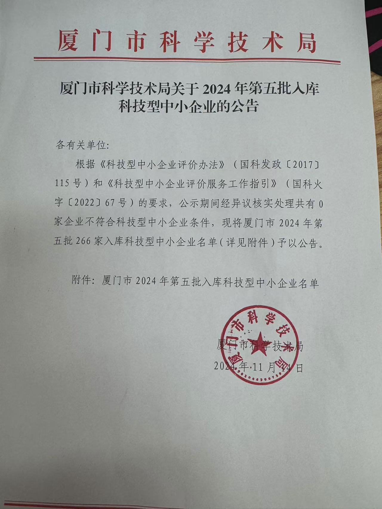 廈門市2024年第5批入庫科技型中小企業(yè)名單公告