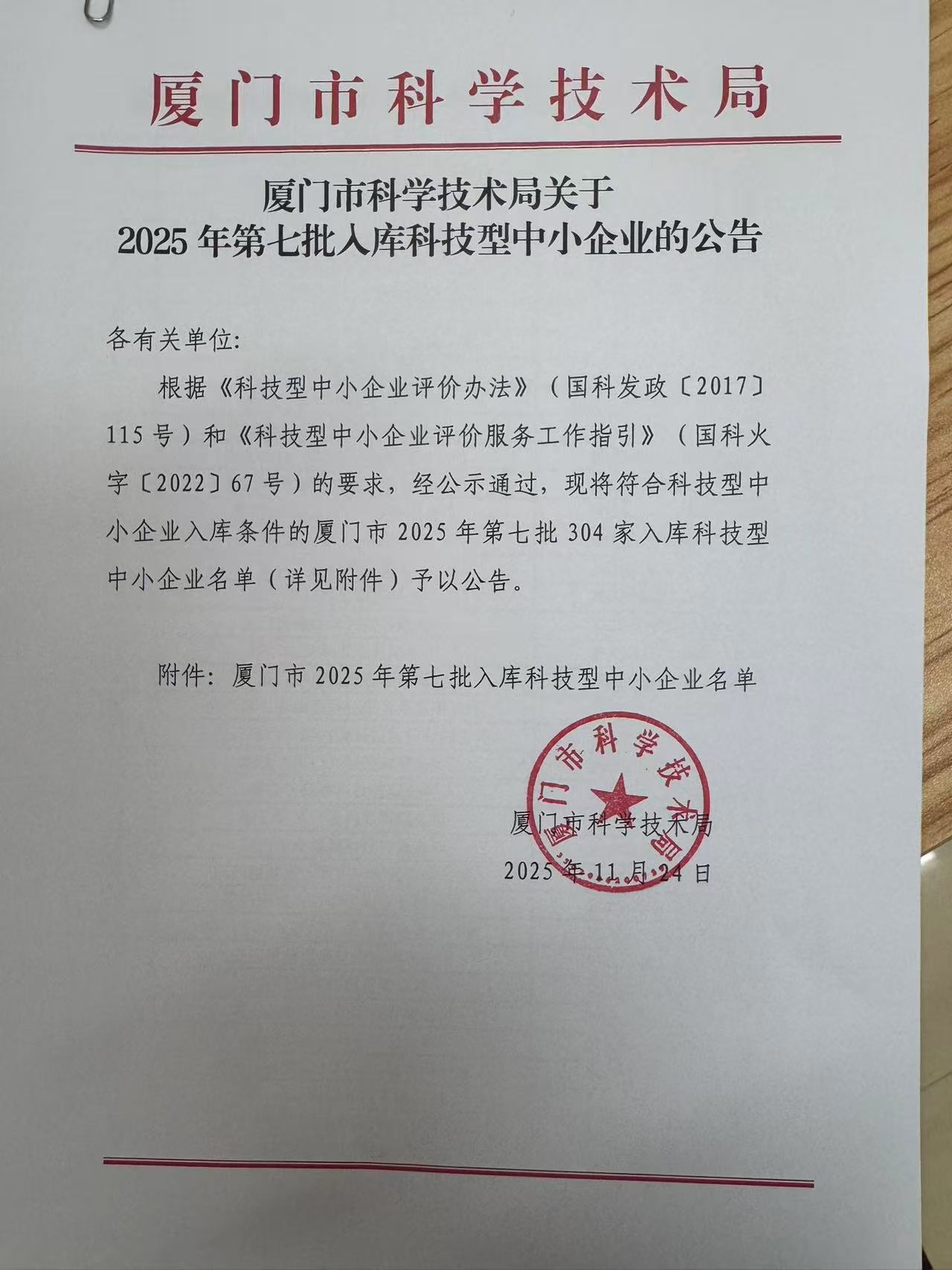 廈門市2025年第7批入庫科技型中小企業(yè)名單公告